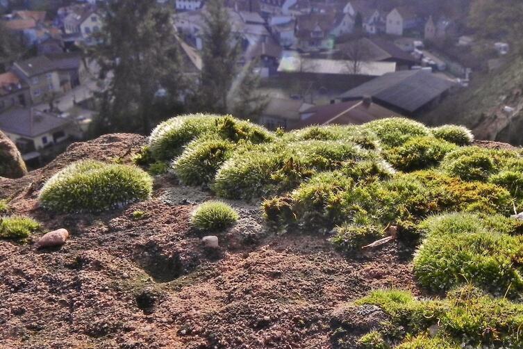 In kleinen rundlichen Polstern wachsen Moose auf Mauern der Hardenburg. Kein einfacher Lebensraum! Wie überstehen sie Frost und Hitze?