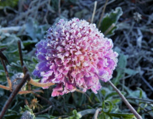Manche Sommerblüten schaffen es bis in den Herbst, mit ihren Farben zu erfreuen. So auch die Skabiose, die jetzt manchmal schon von Reif bedeckt wird.
