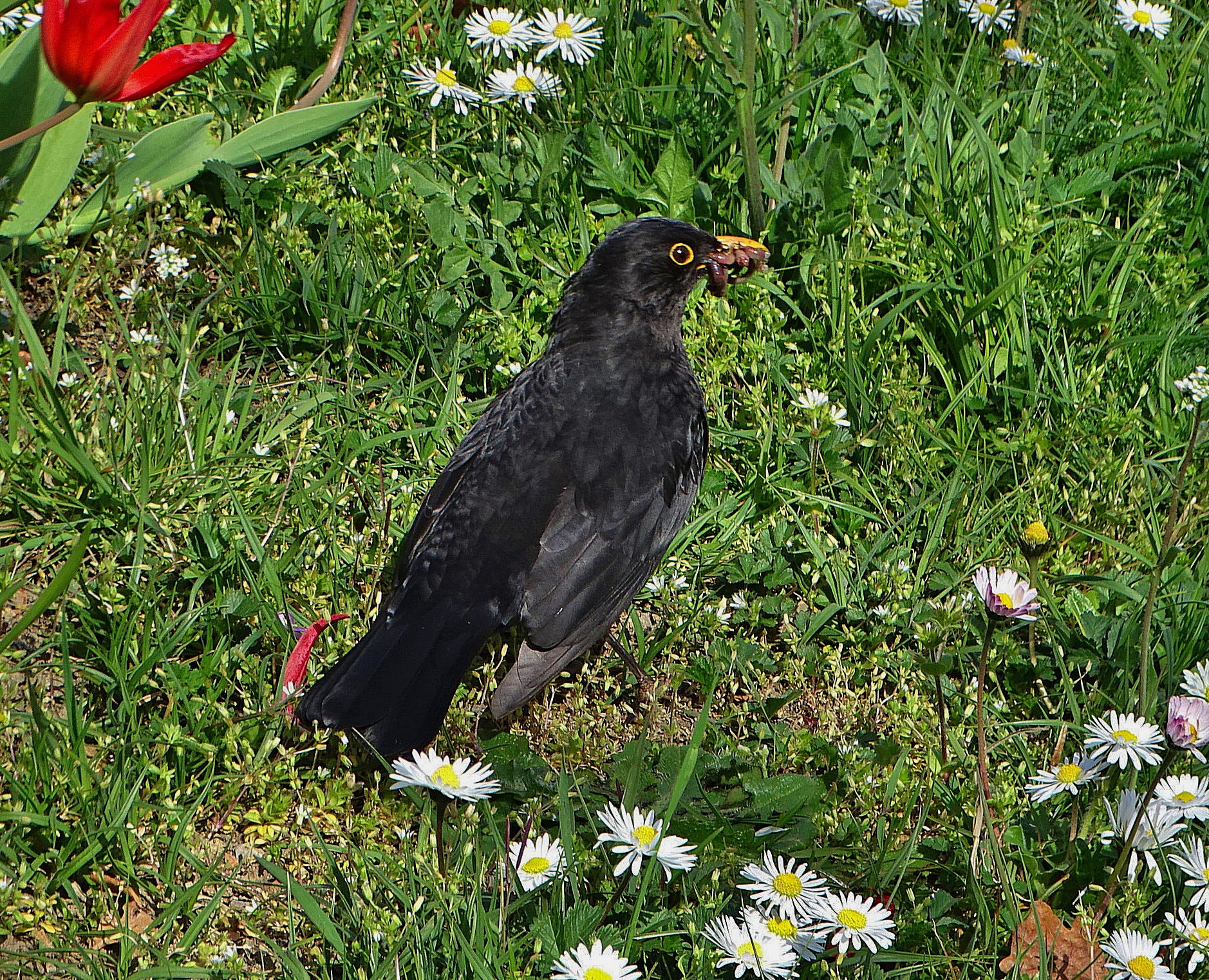 Die Amsel hat den Schnabel voll genommen. Ein ganzes Wurmpaket trägt sie darin. Aus gutem Grund! 09.04.2026